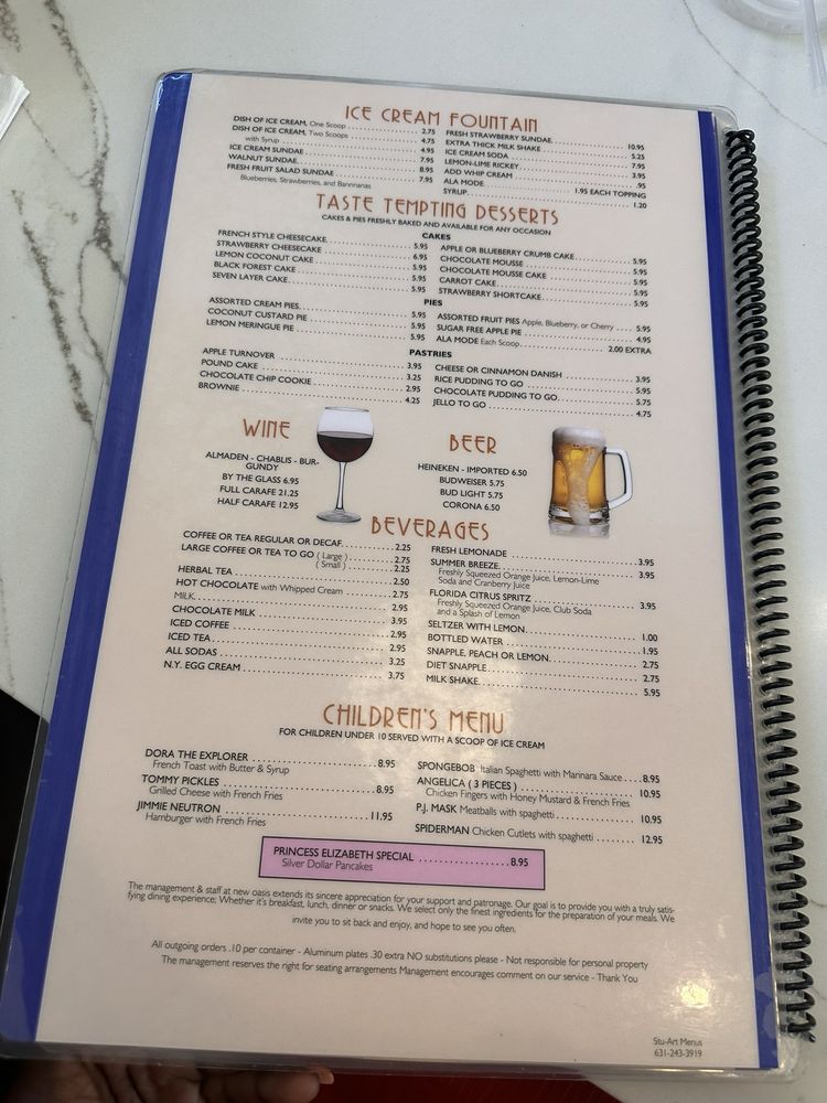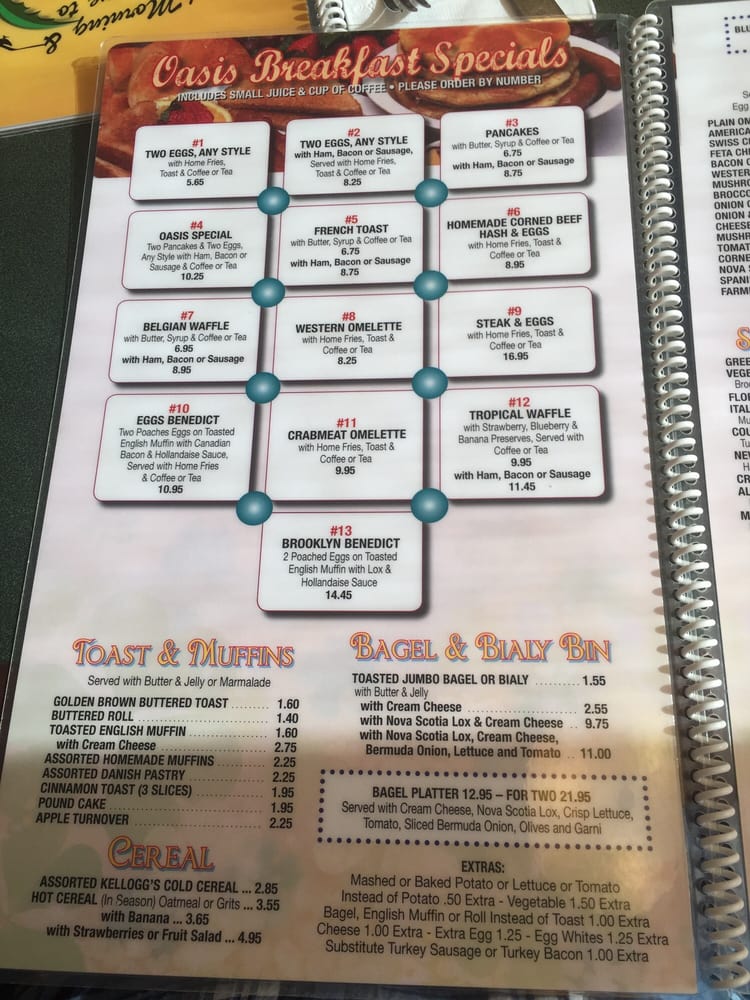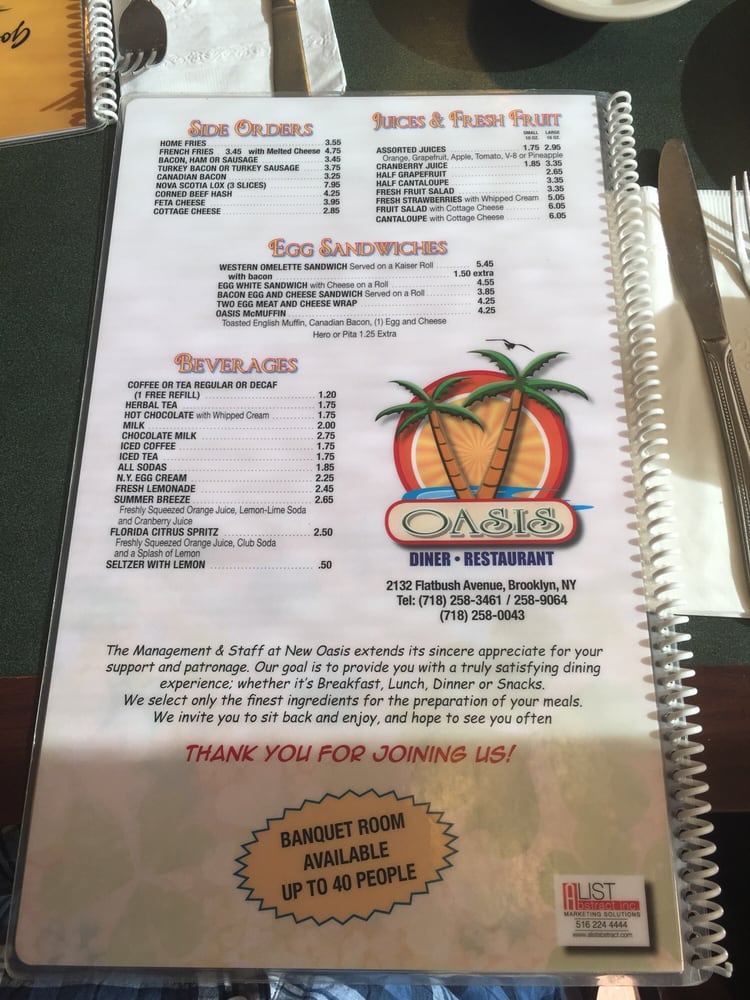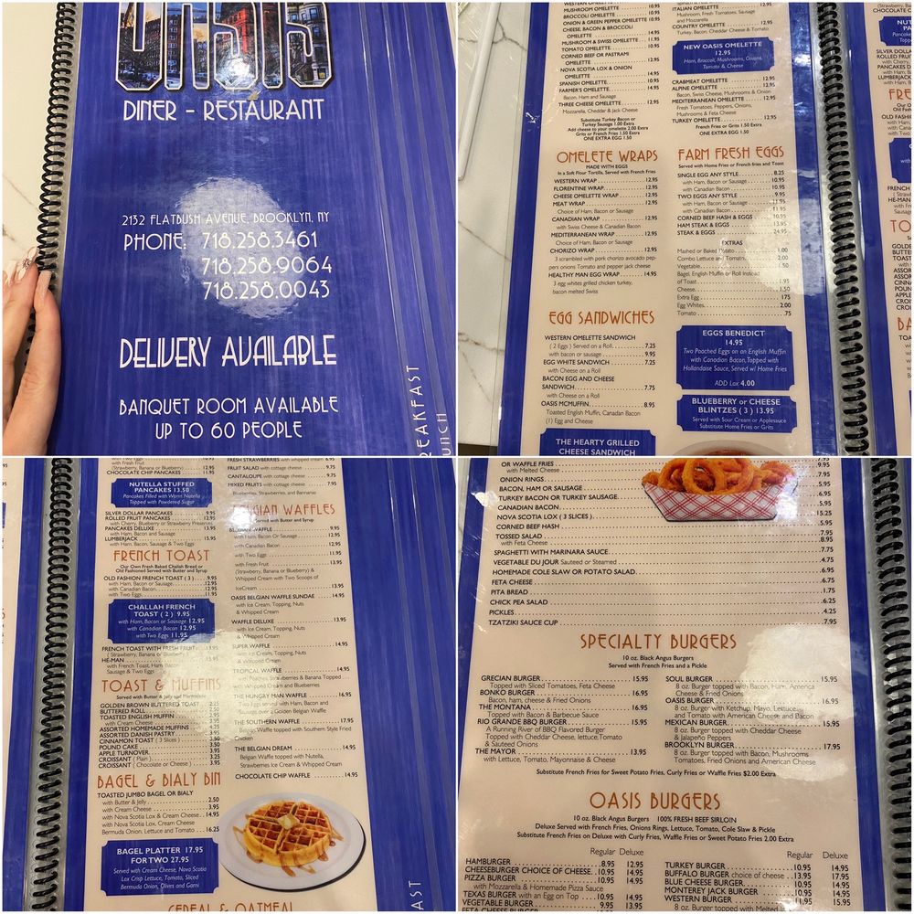 Introducing Oasis Diner Restaurant, located in Brooklyn, NY, a classic diner with a diverse menu catering to all tastes. With options for delivery, takeout, and reservations, Oasis Diner provides a convenient dining experience. The restaurant offers vegan and vegetarian dishes, making it a great choice for those with dietary restrictions. The casual atmosphere and friendly staff create a welcoming environment for families and groups. The menu features a variety of breakfast, brunch, lunch, and dinner options, with highlights such as the crispy bacon, Challah French Toast, and the famous cole slaw. Customers rave about the speedy service, flavorful food, and cozy ambiance. Whether you dine in or take out, Oasis Diner Restaurant promises a satisfying meal every time.